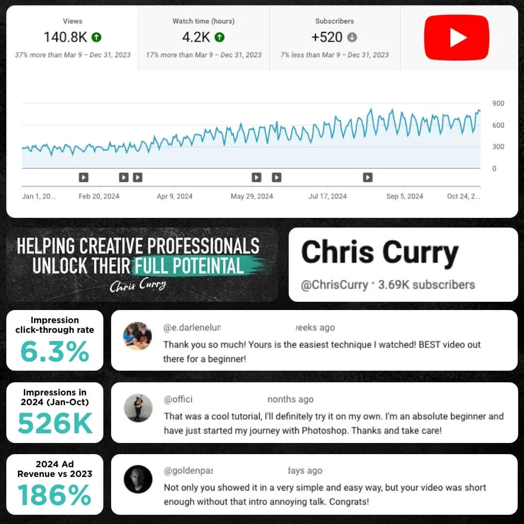 When I’m not working with clients, I’m creating tutorials for my YouTube channel. It’s a space where I give back to the creative community, helping people master Adobe software and creative techniques. I love the methodical process - researching video opportunities, filming, editing, designing thumbnails, and optimising for YouTube SEO. It’s not just about sharing knowledge, but also about refining my own skills with each video. Another way I like to give back is by uploading my photography to Unsplash. Rather than see my personal photography gathering dust, I love to share it with the world.